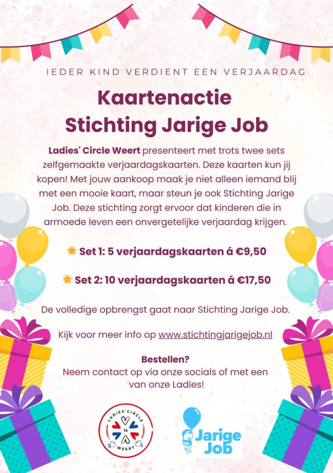 KAARTENACTIE STICHTING JARIGE JOB Ons nieuwe serviceproject voor dit jaar is bekend! We gaan zelfgemaakte verjaardagskaarten verkopen voor Stichting Jarige Job In Nederland zijn er kinderen die hun verjaardag niet…