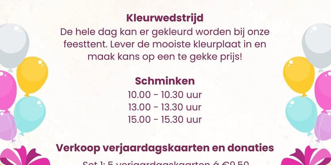 Aanstaande zaterdag 22 februari organiseren een spetterend kinderfeest in de Muntpassage. Op het plein vóór de H&M staan wij met onze feesttent om te schmincken, kunnen de kids kleuren voor de kleurwedstrijd én willen we natuurlijk zoveel mogelijk geld ophalen voor @stichtingjarigejob!